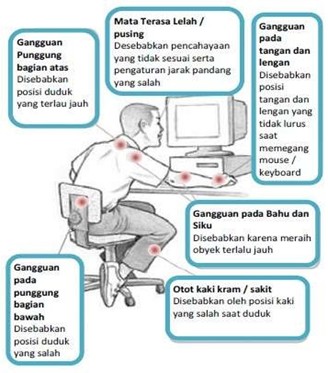 Bekerja secara terus menerus di depan komputer terdapat sejumlah faktor resiko yang dapat menyebabkan gangguan pada sistem otot rangka karena mengerjakan pekerjaan secara berulang-ulang (repetitif), postur tubuh yang tidak normal, serta kurang istirahat. Gangguan ini diawali dengan gejala pegal-pegal dan kemudian rasa nyeri ringan, setelah terakumulasi dalam waktu yang lama rasa nyeri akan terasa dalam waktu yang lama.