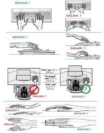 Posisi yang salah dalam pemakaian keyboard dan mouse bisa berakibat carpal tunnel syndrome (CTS), Beberapa hal yang harus diperhatikan agar terhindar dari masalah tersebut adalah :